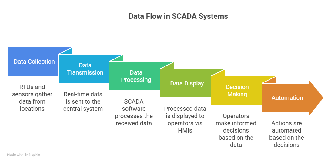 Here’s how data flows in a SCADA system, which involves several key steps: